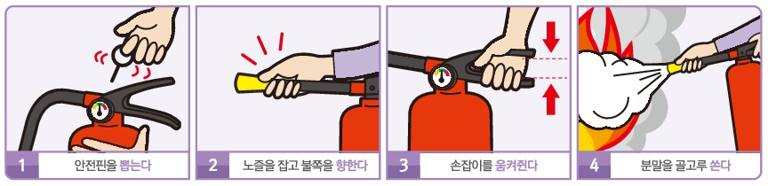 - 소화기를 가져와서 몸통을 단단히 잡고 안전핀을 뽑는다.