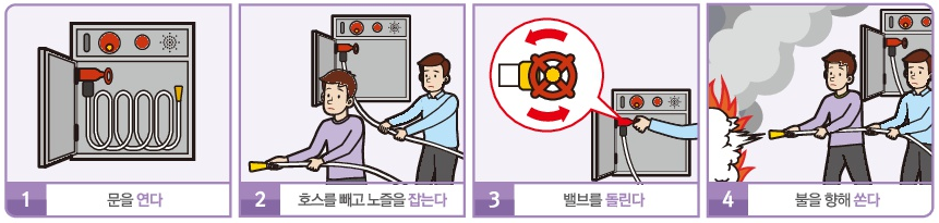 - 2명중 1명이 먼저 소화전함의 문을 열고 호스와 노즐이 연결되어 있는지 확인한 후