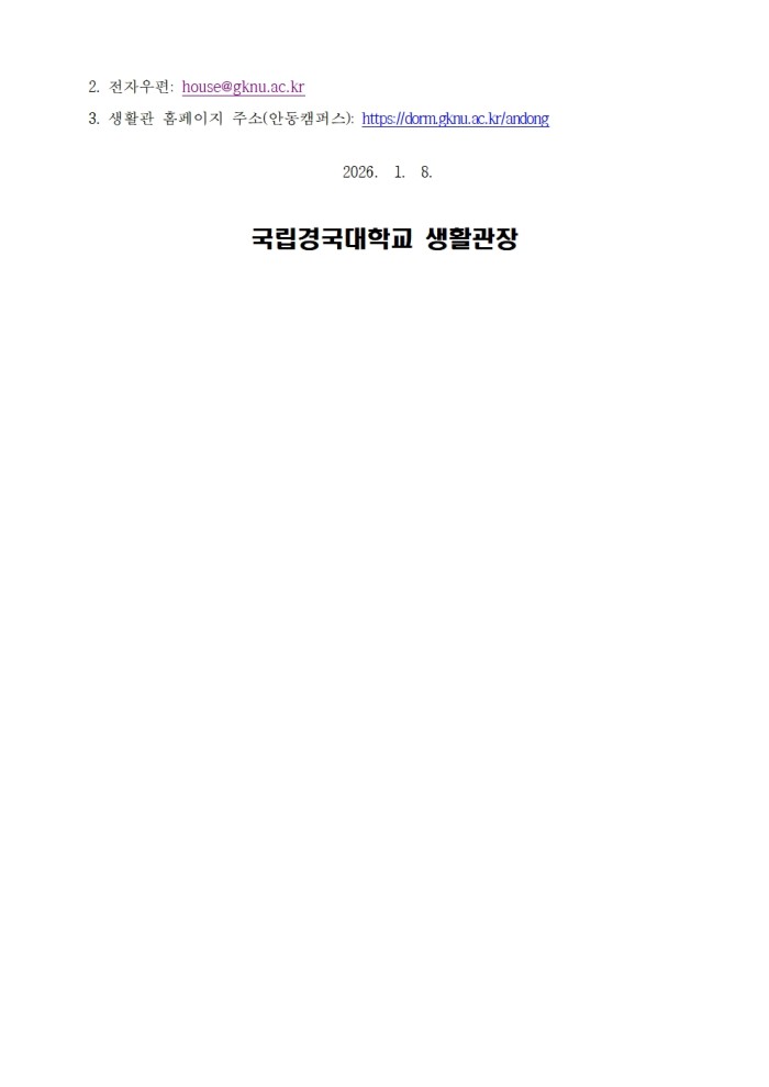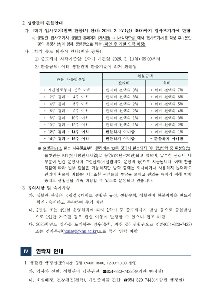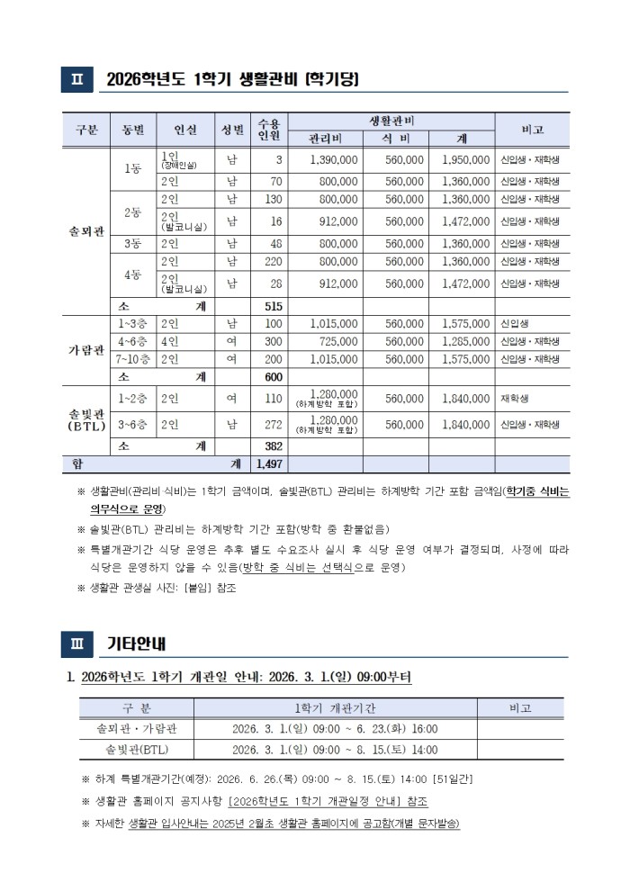 생활관비 납부기간: 2026. 1. 20.() 09:00 ~ 1. 22.() 16:00 [3일간]