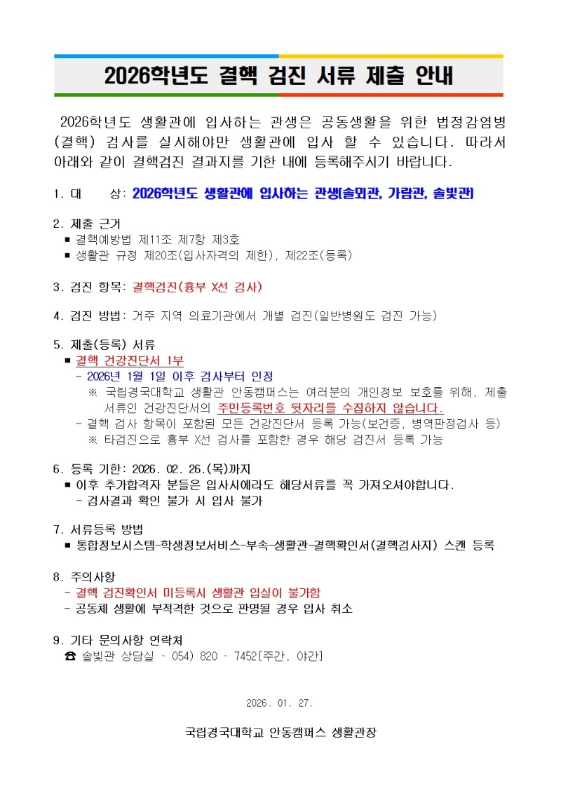 2026학년도 결핵 검진 서류 제출 안내