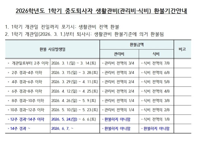 ※ 자세한 환불안내는 [중간퇴사자 생활관비(관리비,식비) 환불안내] 참조